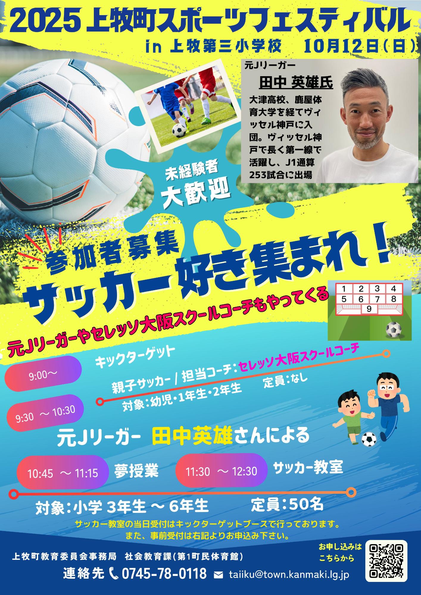 セレッソ大阪のコーチによる親子サッカー体験や、元Jリーガーの田中英雄さんによる夢授業・サッカー教室は事前申込みが必要となります。